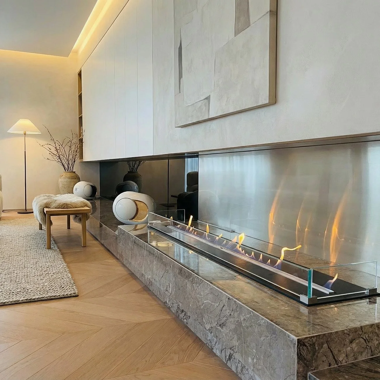 Built-in bioethanol fireplaces create an elegant and seamlessly integrated look in modern interiors. They can be incorporated into walls, furniture or architectural elements, resulting in clean lines with full focus on the flames.
