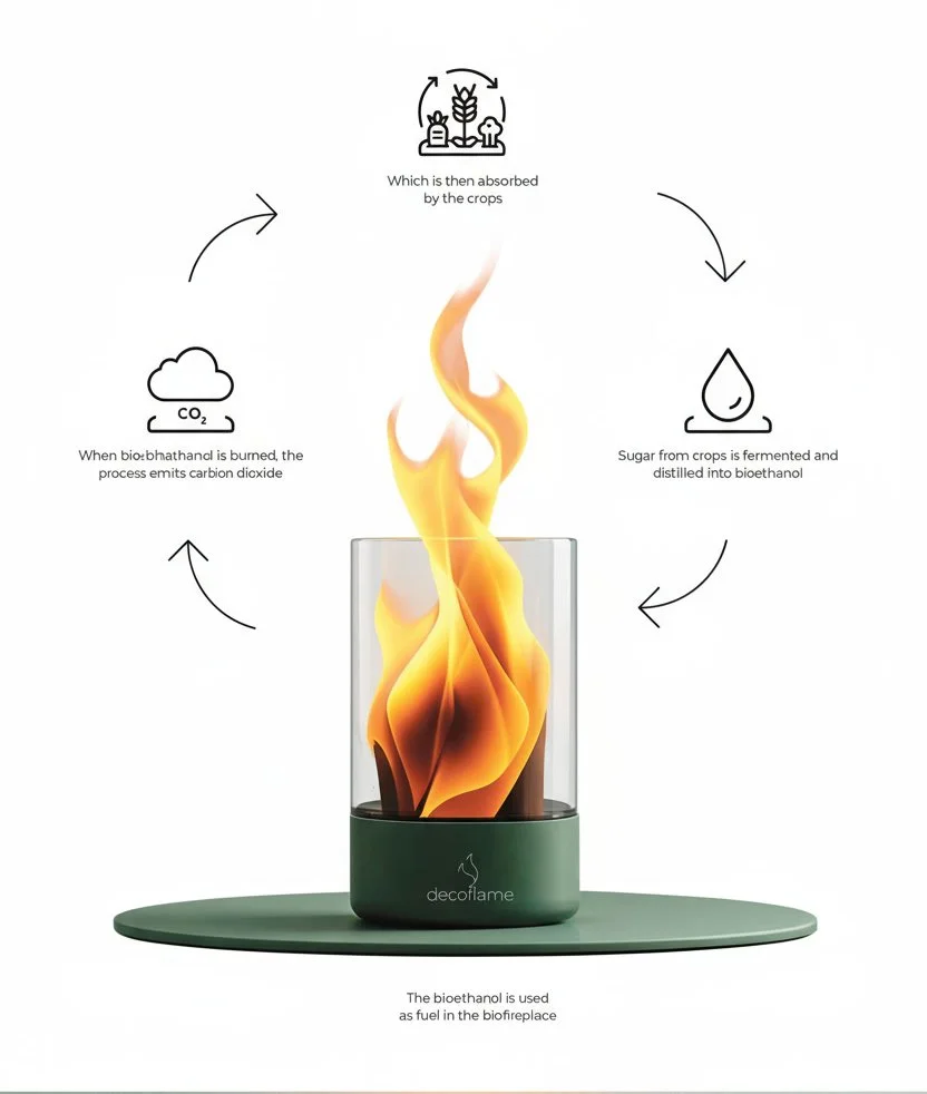 A carbon-neutral energy cycle aligns perfectly with today’s focus on sustainability and environmental responsibility. When used as fuel in Decoflame fireplaces, bioethanol creates a gentle warmth that beautifully combines aesthetics, comfort, and ecological awareness.